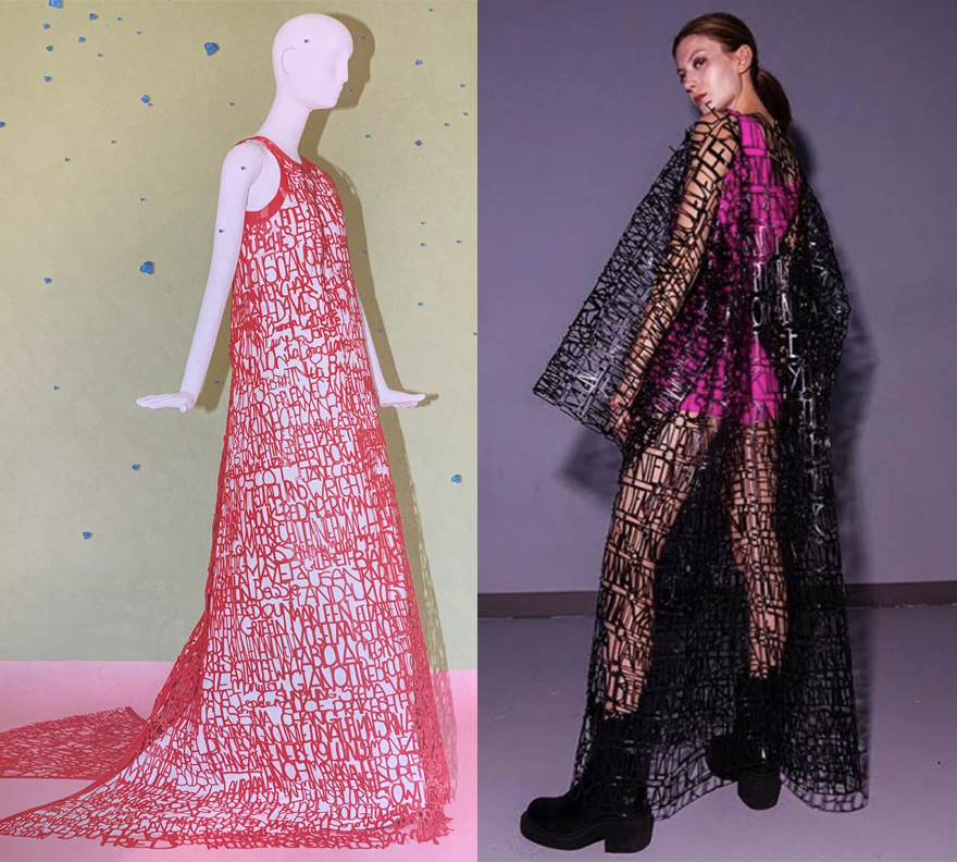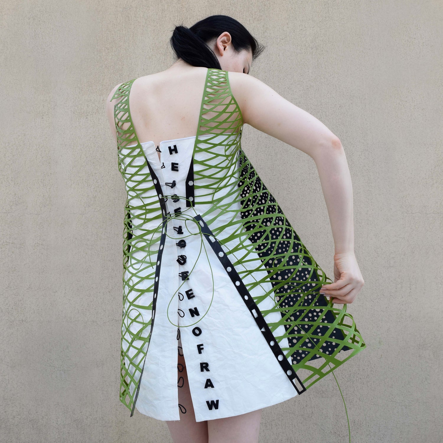 3D printed zero-waste gown made of compostable bioplastic honoring women in STEM, NamesDress was created in 2019 for the “Sustainable Thinking” exhibition at Museo Ferragamo in Florence and composted into the earth in 2022 at The Canvas in NYC.