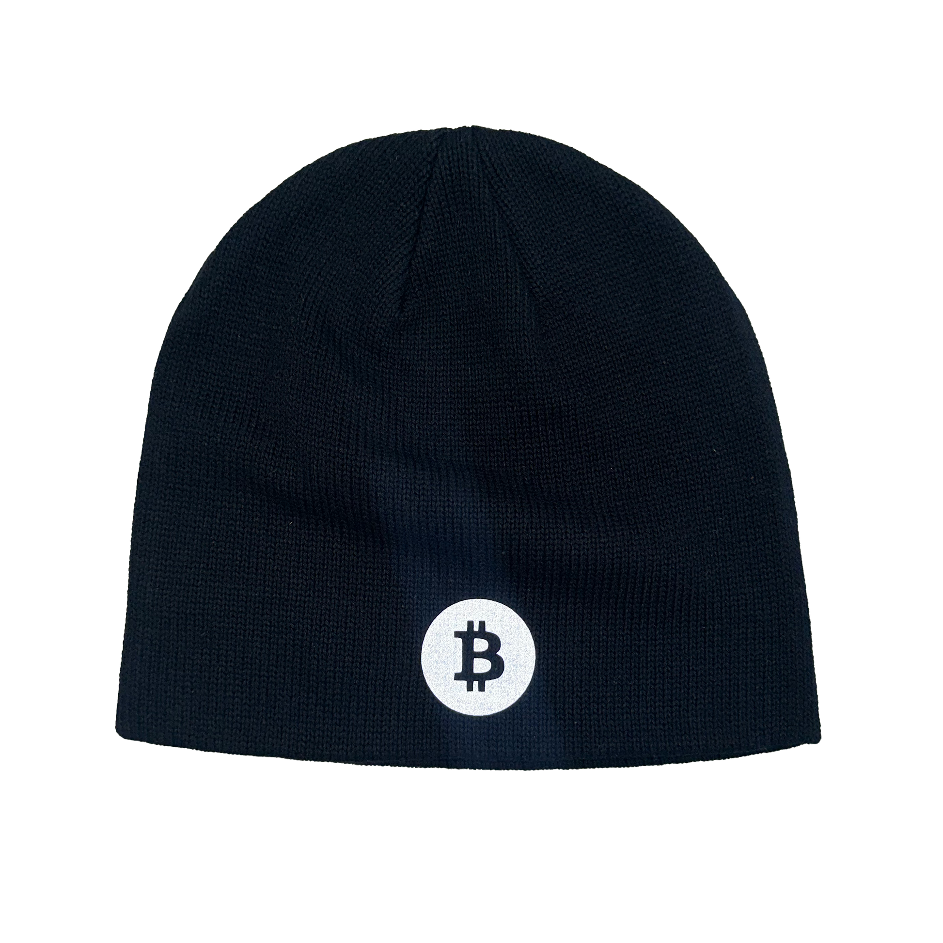 Organic cotton beanie in black with silver 3M reflective Bitcoin symbol.